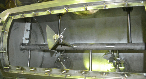 Устройство ленточного смесителя. В качестве рабочего органа ленточного смесителя используется вал с навитой лентой . В основе работы - процесс смешивания со сдвигом, продукт с помощью ленты перемещается слоями . Смешивание производится ленточными спиралями , которые не только перемешивают , но и передвигают смешиваемый материал . В смесителях непрерывного действия лопасти закрепляются на валу по винтовой линии , что обеспечивает одновременное перемешивание и перемещение продукта вдоль вала . Подробнее
