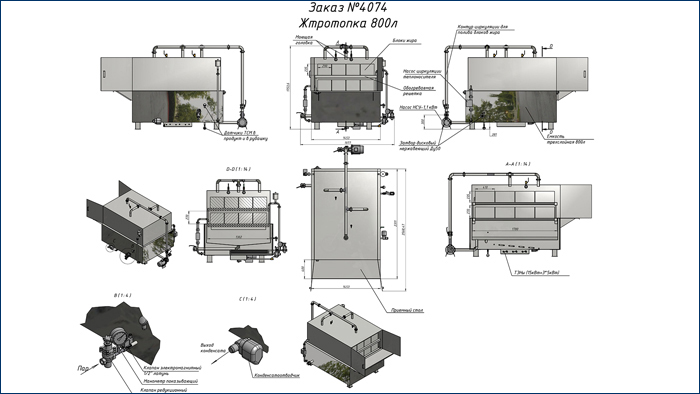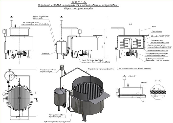 Жиротопка - двустенный резервуар с встроенными ТЭНами, установленный на опорах. Для удобной эксплуатации и повышения производительности жиротопки теплопередающие трубки расположены под наклоном. Также предусмотрен для жиротопки съемный кожух - крышка над теплопередающей трубой, рециркуляционный насос с трубопроводом. |