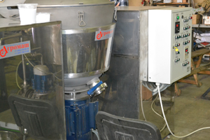 Вакуумный карамелеварочный котел 50-100л. раб. Вакуумная емкость трехслойная 80-120л геом проточная часть из меди, с увеличенной термоизоляцией, с коническим дном, на сливе «грибковая пробка», с ТЭНами 15-30кВт (ступенчатый нагрев 2х15 или 6х5кВт), рубашка под глицерин до 290гр.С, крышка герметичная с люком , датчики ТСП (платиновые) в продукт и в рубашку до 290грС, нержавеющий кран Ду50. Перемешивающее устройство из меди рамного типа с фторопластовыми скребками мотор-редуктор 28-35 об/мин вынесен выше вверх, узел герметизации под вакуум. Пеногаситель. Пульт управления, включая 2-х канальный измеритель, система вакуумирования, регулятор. Таймер. Диаметр внутренний 600мм, наружный 700мм, высота загрузки 1300мм, высота слива 400мм |