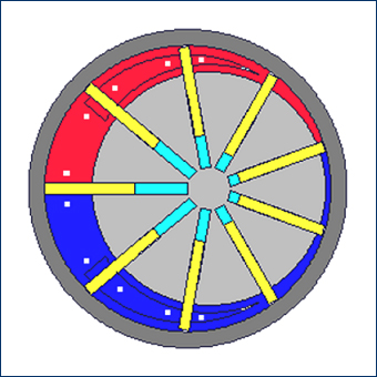 Рабочий орган пластинчатоо (шиберного) насоса выполнен в виде эксцентрично расположенного ротора, имеющего продольные радиальные пазы, в которых скользят плоские пластины (шиберы), прижимаемые к статору центробежной силой. Так как ротор расположен эксцентрично, то при его вращении пластины, находясь непрерывно в соприкосновении со стенкой корпуса, то входят в ротор, то выдвигаются из него. Во время работы пластичатого (шиберного) насоса на всасывающей стороне образуется разрежение и перекачиваемая масса заполняет пространство между пластинами и далее вытесняется в нагнетательный патрубок. . |