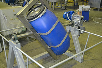 Смеситель СМУ-ПБ оснащен держателем с торцевым зажимом для тары заказчика или сменных емкостей. Закрепленная бочка (емкость) с продуктом вращаются, обеспечивая смешивание продукта.